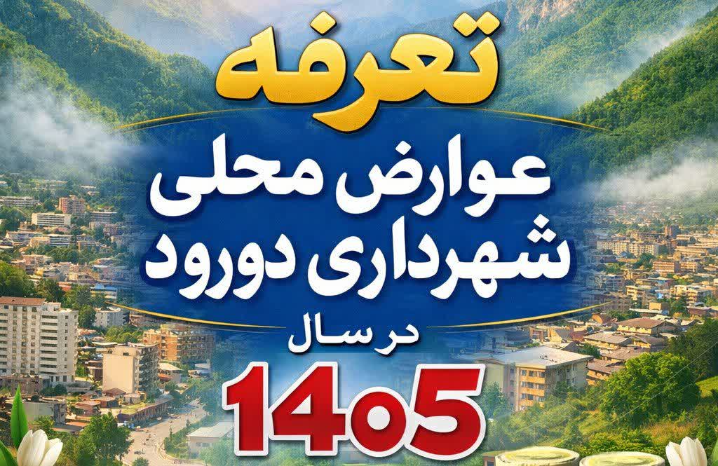 احتراما به اطلاع شهروندان شهر دورود میرساند که تعرفه عوارض محلی،بهای خدمات و سایر درآمدهای سال ۱۴۰۵ شهرداری دورود که طی نامه شماره ۱۳/۱۹۷۰۱مورخ ۱۴۰۴/۱۱/۲۵ کمیسیون تطبیق فرمانداری و نامه شماره ۱۰۷۳ مورخ ۱۴۰۴/۱۱/۲۷ شورای محترم اسلامی شهر دورود تصویب گردیده است اعلان عمومی میگردد. جهت مشاهده تعرفه ها روی تصویر زیر کلیک کنید